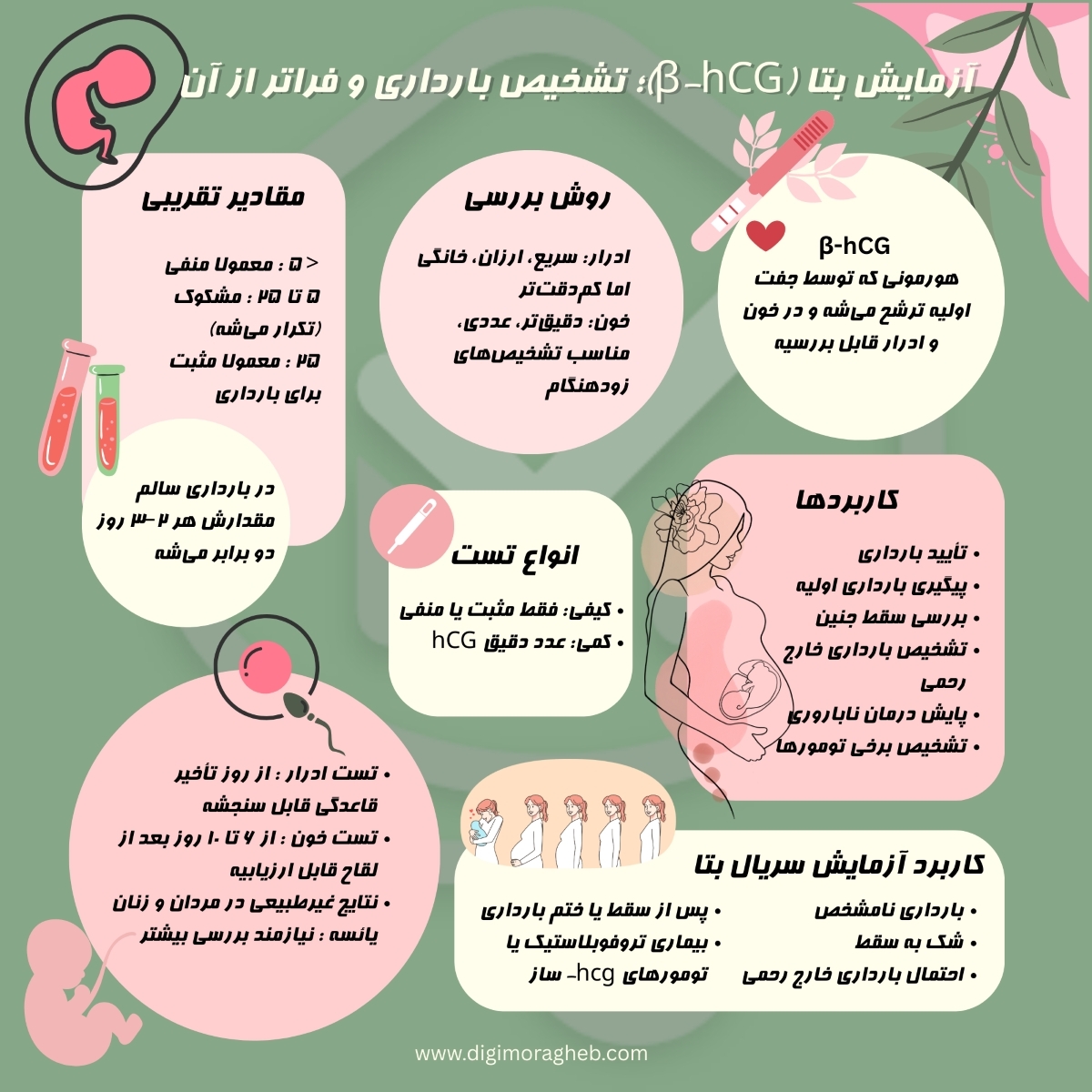 مقدار دقیق hCG در خون را اندازه میگیرد. این روش برای پیگیری روند بارداری یا بررسی مشکلات و بیماریهای احتمالی کاربرد دارد.